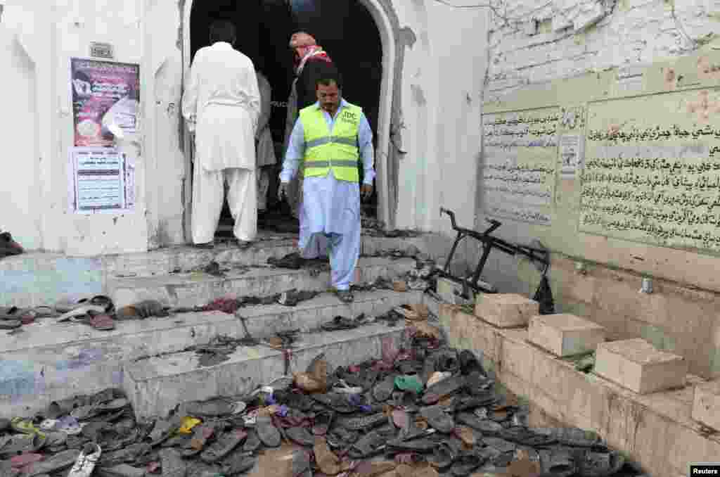 A rescue worker surveys the scene outside a Shi'ite mosque after an explosion in Shikarpur, Sindh province, Pakistan, Jan. 30, 2015.