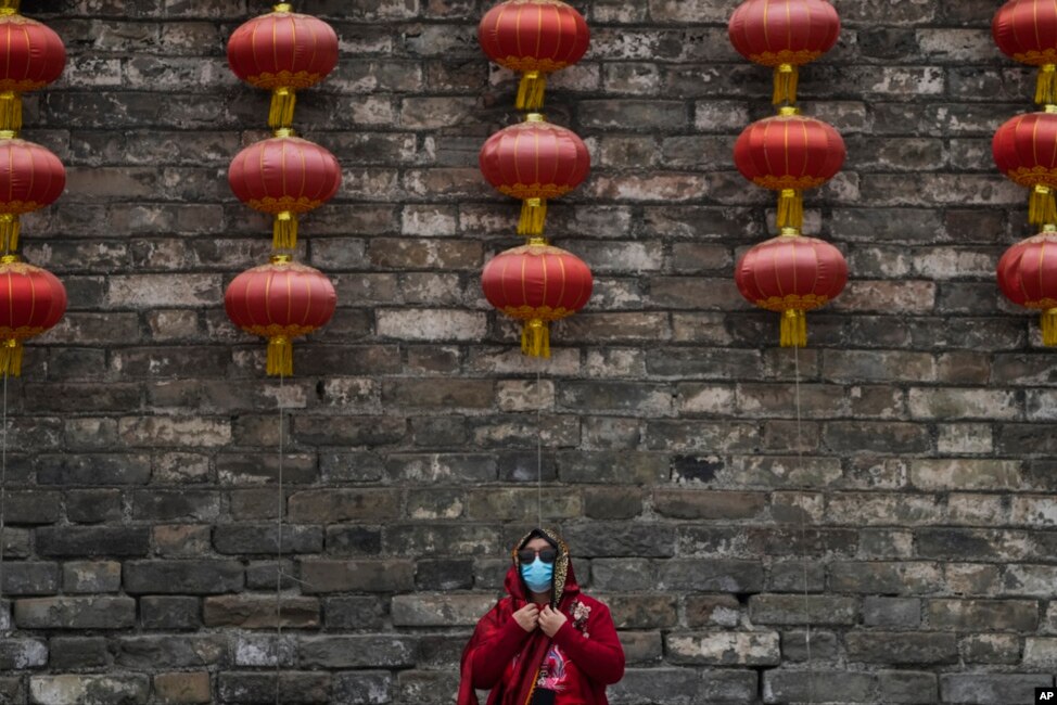 A woman wearing a face mask adjusts her scarf near a wall with lanterns on display in Beijing.