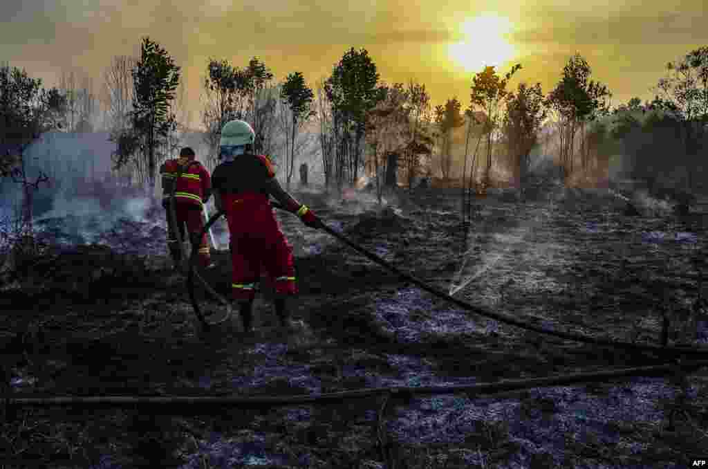 Firefighters extinguish a fire in Kampar, Riau province on Indonesia's Sumatra island.