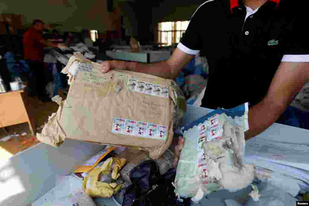 A Palestinian worker displays items sent by mail in the West Bank city of Jericho. Postal workers have been sorting through thousands of mail sacks for the past several days after Israeli authorities allowed the entry of the letters and packages from neighboring Jordan. The 10.5 tons of mail had been held in Jordan since 2010 because Israel would not permit direct transfer to the Palestinian Authority in the West Bank, Palestinian officials said.