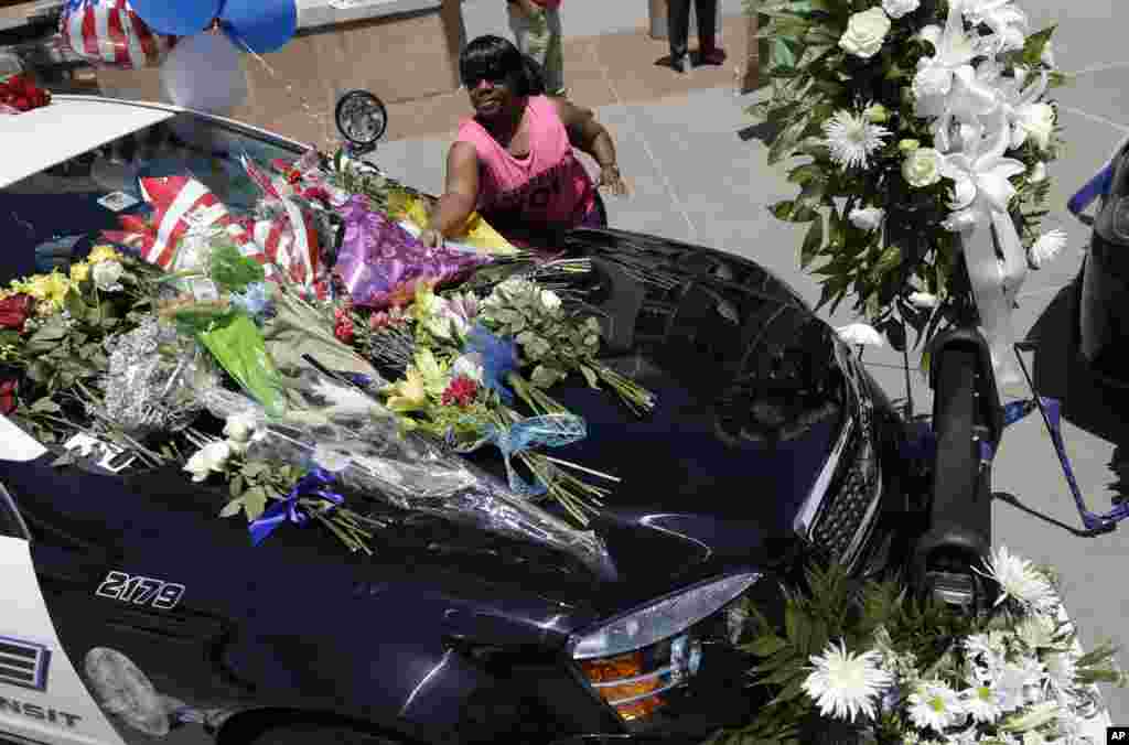 Cynthia Ware places flowers on a makeshift memorial at the Dallas police headquarters, July 8, 2016, in Dallas.