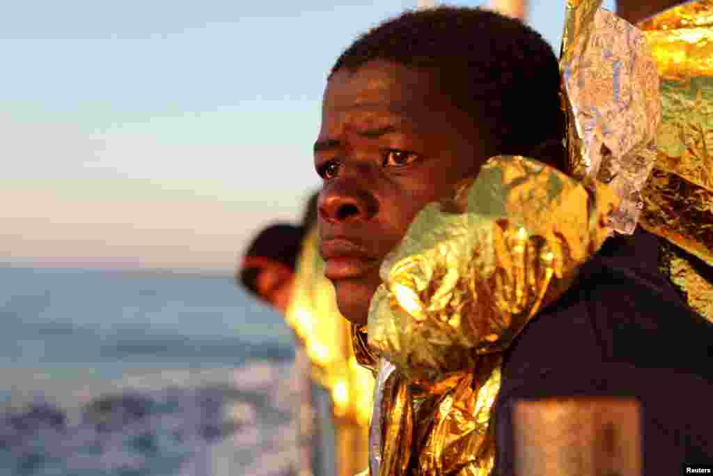 A migrant, covered with a thermal blanket, gazes at the sea aboard the former fishing trawler Golfo Azzurro of the Spanish NGO Proactiva Open Arms following a rescue operation near the coast of Libya in the central Mediterranean Sea.