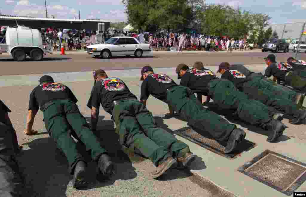 A wildland firefighting crew does 19 push-ups next to a memorial in honor of the 19 firefighters killed in the nearby wildfire in Prescott, Arizona, July 8, 2013.