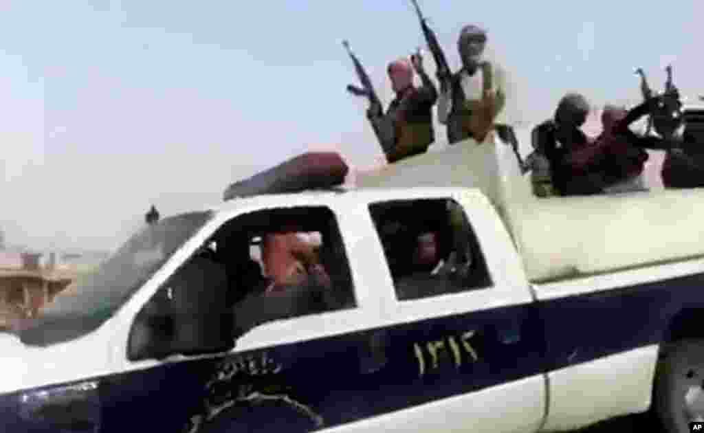 This June 17, 2014 image taken from video uploaded to a militant social media account shows Islamic State of Iraq and the Levant militants arriving at the oil refinery in Beiji, Iraq.