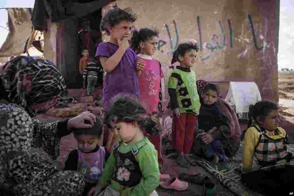 Syrian internally displaced families gather on abandoned land where they have taken shelter after fleeing their village that turned into a battlefield in Idlib province, Sept. 22, 2013.
