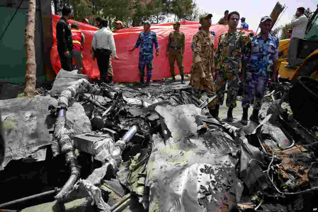 Iranian security and rescue personnel work the site of a passenger plane crash near the capital Tehran, Iran, Aug. 10, 2014.