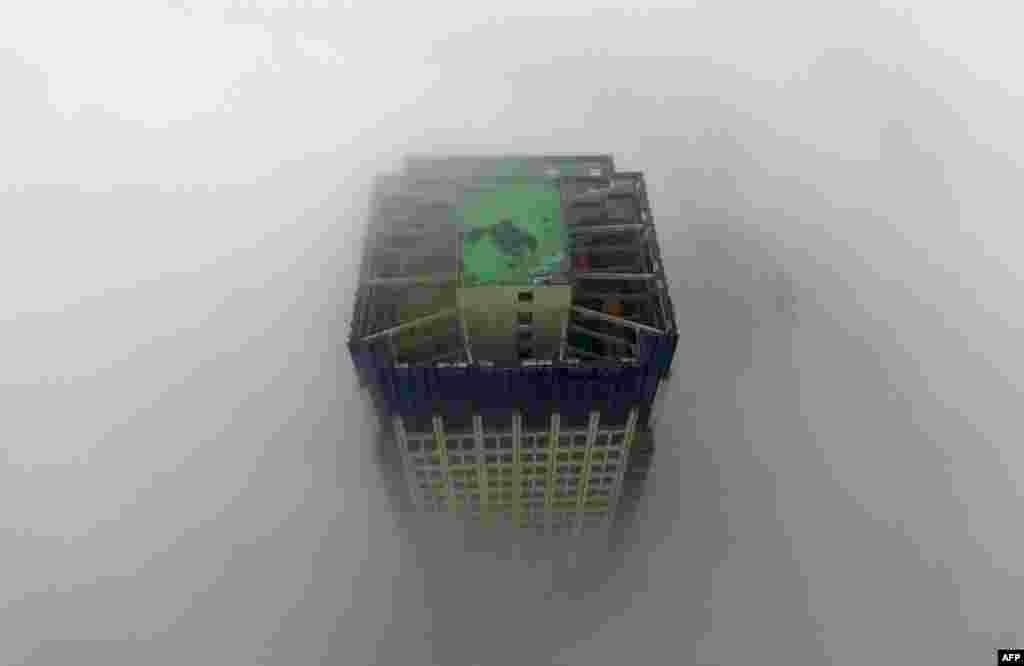 A building appears through a thick layer of fog in Yangzhou, in China's eastern Jiangsu province.