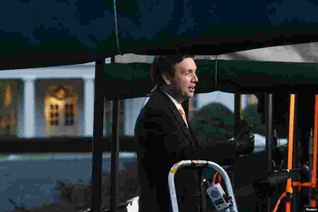 White House Press Secretary Josh Earnest gives a remote network television interview about the upcoming State of the Union address outside the of the West Wing of the White House in Washington, Jan. 20, 2015.
