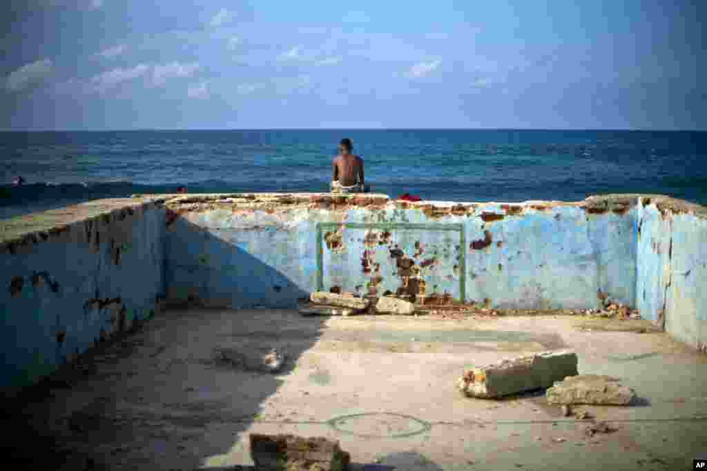 A young man looks at the sea sitting on the wall of an old abandoned pool in Cojimar, Cuba.