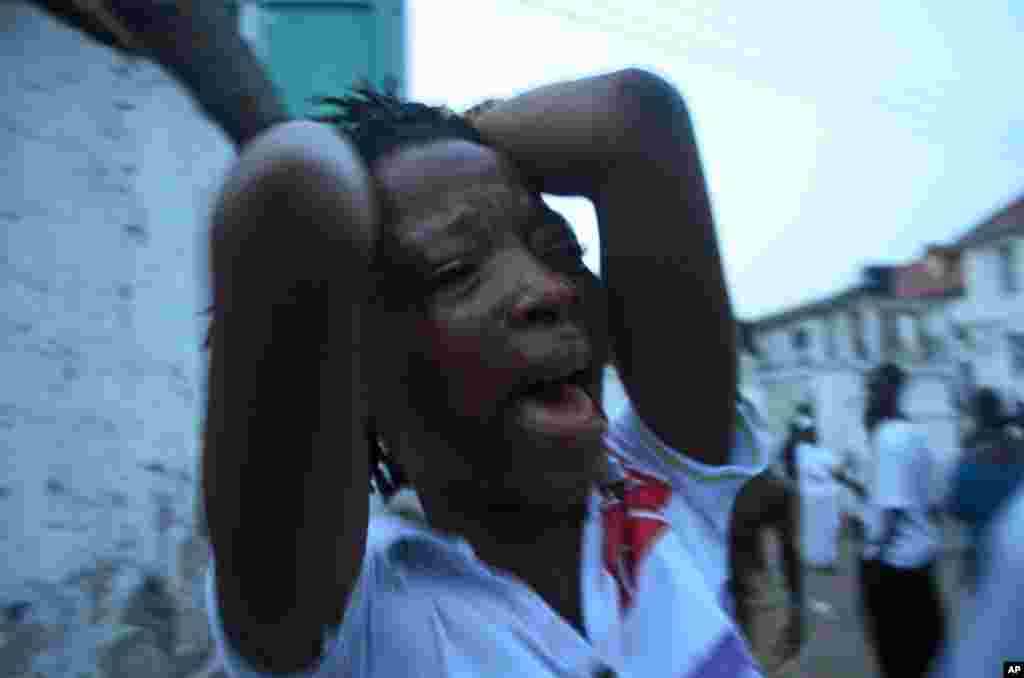 ຜູ້ສະໜັບສະໜຸນຜູ້ນຶ່ງຕໍ່ພັກປະຊາຊົນ Sierra Leone ຫລື SLPP ທີ່ເປັນພັກຝ່າຍຄ້ານນັ້ນ ຮ້ອງໄຫ້ ຢູ່ນອກຫ້ອງການຂອງທ່ານ Julius Maada Bio ຜູ້ສະໝັກເລືອກ ຕັ້ງຈາກພັກ SLPP ລຸນຫລັງມີການປະກາດວ່າ ທ່ານເສຍໄຊໃນການເລືອກຕັ້ງແລ້ວ, ຢູ່ໃນນະຄອນ Freetown ໃນວັນສຸກ ທີ 23 ພະຈິກ 2012. (AP Photo/Tommy Trenchard)