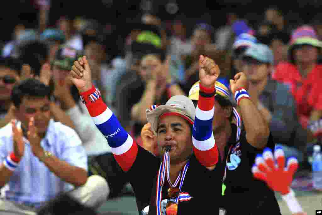 An anti-government protester raises his hands as he listens to a speech by protest leader Suthep Thaugsuban during a rally in Bangkok, Feb. 25, 2014.